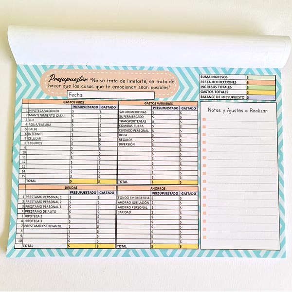 Contenido: 50 páginas con distribución para presupuestos quincenales o mensuales